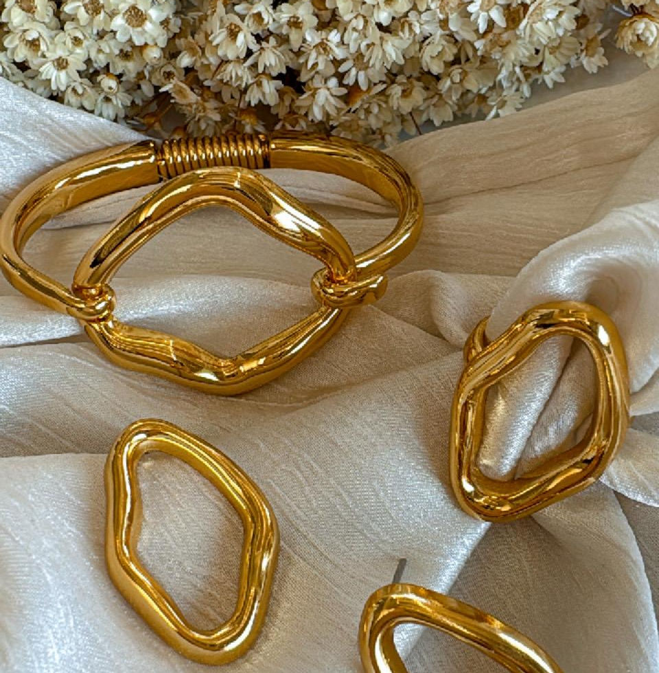 Acompanha 2 braceletes m, 1 par de brincos e 1 anel tamanho 20.